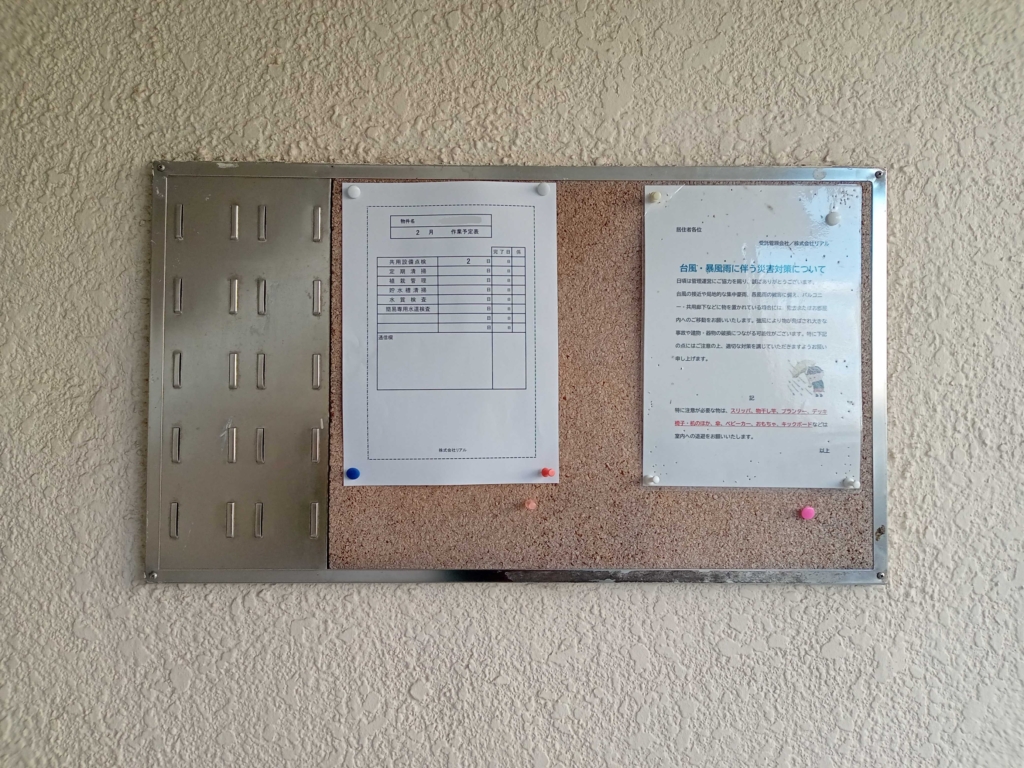 一見すると小さな設備ですが、掲示板は入居者の皆さまにとって日常的に目にする大切な情報共有の場です。そこで今回、弊社より掲示板の更新をご提案させていただき、サイズの拡大・マグネット対応の掲示板へ変更したことで、複数の案内文を整理して掲示することができ、内容の差し替えも容易になりました。