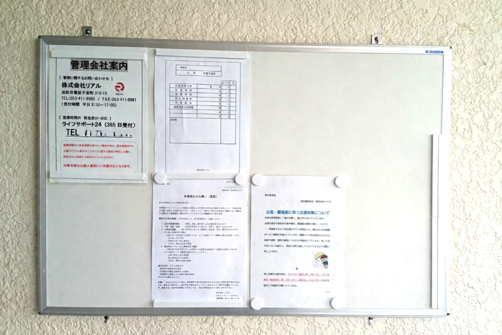 浜松市中央区にある40戸の分譲マンションでは、これまで使用していた掲示板が小さく、十分な情報を掲示できないという課題がありました。掲示スペースの不足により、重要なお知らせや生活に関わる情報が分かりづらくなってしまう場面も見受けられていました。